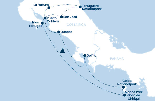Diese Reise bringt Sie zu den wildromantischen Wasserwegen des Tortuguero Nationalparks, wo Faultiere in Baumkronen dösen und Tukane durch das Blattwerk gleiten. Am majestätischen Vulkan Arenal erwarten Sie dampfende Regenwälder, brodelnde Thermalquellen und der eindrucksvolle Blick auf die Silhouette des Vulkans. Zwischen den Naturwundern begegnen Sie auch dem Geschmack des Landes: Sie besuchen eine traditionelle Ananasplantage, verkosten frisch gerösteten Kaffee direkt auf einer Farm und entdecken bei einer Bierverkostung die kreative Seite der costa-ricanischen Braukunst. Im zweiten Teil Ihrer Reise heißt es: Segel setzen. An Bord der eleganten Star Clipper gleiten Sie entlang der Pazifikküste Costa Ricas und Panamas, vorbei an tropischen Buchten, dichten Regenwäldern und traumhaften Stränden. Bevor Ihre Reise endet, führt Sie ein Bootsausflug auf dem Río Tárcoles durch Mangrovenlandschaften, in denen Krokodile, Reiher und andere exotische Tiere aus nächster Nähe zu beobachten sind – ein letztes Eintauchen in die wilde Schönheit Costa Ricas. Zum Abschluss genießen Sie ein stilvolles Farewell-Dinner in der Hauptstadt San José, wo Sie bei landestypischen Aromen und einem Glas Wein die vielen Eindrücke Revue passieren lassen, ganz im Sinne von „Pura Vida“.