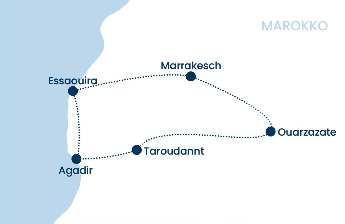 Zwischen den Gassen Marrakeschs, dem goldenen Licht der Agafay-Wüste und der salzigen Brise des Atlantiks entsteht ein vielschichtiges Reisebild aus orientalischer Pracht, landschaftlicher Weite und lebendiger Kultur. Historische Kasbahs, farbenreiche Souks und sorgfältig ausgewählte Genussmomente verbinden sich mit stilvollen Rückzugsorten zu einer Reise, die den Zauber des Landes auf besonders atmosphärische Weise erfahrbar macht.
