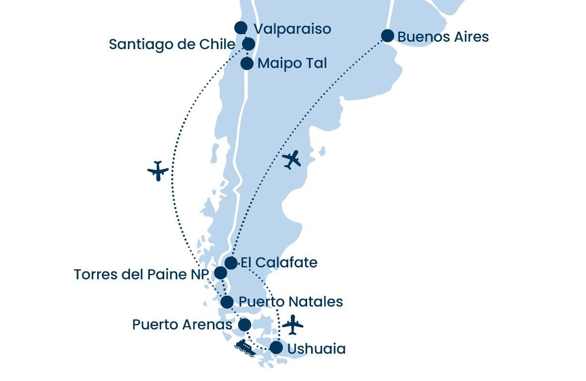 Santiago de Chile und Valparaíso begeistern mit kolonialem Charme, farbenfrohen Hügelvierteln und kulinarischen Genüssen, während das fruchtbare Maipo-Tal die Welt des chilenischen Weins offenbart. Im Torres-del-Paine-Nationalpark und am gewaltigen Perito-Moreno-Gletscher zeigt sich die Natur in ihrer eindrucksvollsten Form. Den glanzvollen Abschluss bildet Buenos Aires mit leidenschaftlichem Tango, beeindruckender Architektur und exzellenter Küche.